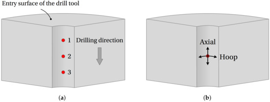 Figure 14 shows the evolution of temperature distributions inside the drilled component. The distributions plotted correspond to phases 1, 2 and 3, respectively, for a point located at mid-depth on the hole surface. As shown in Figure 14b, the surface of the hole is kept hot after the passage of the drill tip. This corresponds to the thermal plateau phenomenon (phase 2) modeled by means of parameters and in Equation (1). Moreover, we can see that the temperature in the cutting zone increases during the drilling operation.