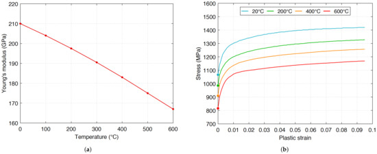 Elasto-plastic properties of the Inconel 718 superalloy: (a) Young’s modulus [22]; and (b) plastic strain–stress curves [23].
