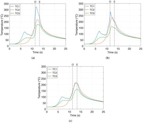 The thermal kinetics obtained for the three drilling tests are presented in Figure 8. Times “O” and “E” correspond to the output of the drill tip from the bottom surface and the nearly instantaneous upward ejection of the tool, respectively. For each test, the thermocouple TC1 located at a distance of 500 m from the hole surface shows a first temperature peak at the instant corresponding to the passage of the drill tip ( s). This peak is directly caused by the heat dissipated by the material removal mechanisms in the cutting zone. It should be noted that for the thermocouple TC3 located at a distance of 2 mm from the hole surface, no peak is identified despite a temperature rise consistent with the drill tool depth.
