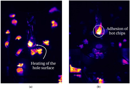Once the drill cone has completely crossed the workpiece bottom surface (time “O”), the temperature remains relatively high for the three thermocouples for approximately 2 s, before the nearly instantaneous upward ejection of the tool (denoted “E” in Figure 8). This period corresponds to the time during which the drill still goes along its trajectory to be sure to finalize the hole. Indeed, when the drill tip goes out of the workpiece, the cutting edges no longer produce chips. Thus, the chips located in the flutes are no longer evacuated due to the lack of new chips that can push the older ones. The last hot chips remain trapped in the hole before the nearly instantaneous upward ejection of the tool (see Figure 9b) which rises up here at a speed of 250 mm/s. After that, the cooling of the drilled part with the ambient air can be observed for all experimental thermal kinetics.