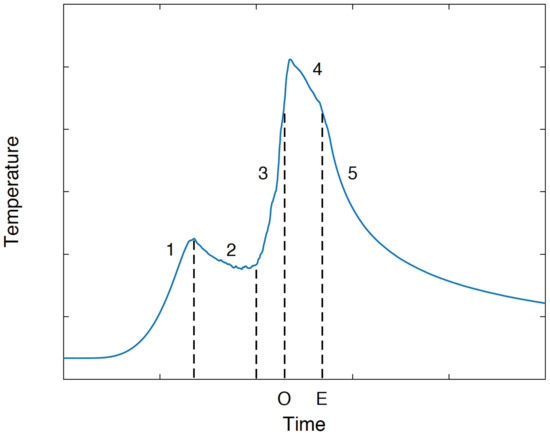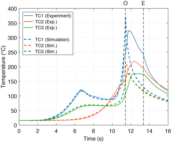 where and denote, respectively, the temperature and an exchange coefficient that allow modeling the thermal plateau of phase 2 [20]. and n are calibrated by means of experimental thermal kinetics and more particularly the average thermal kinetics obtained with thermocouples. and n were estimated to be 1000 W·m·C and 2.1, respectively. These values allow achieving the average maximum temperature obtained for thermocouples TC2 and TC3 as shown in Figure 13.