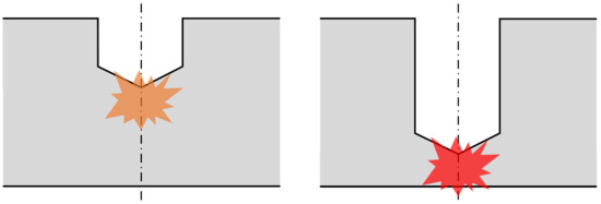 Because of this compressive hoop stress, the thermal expansion induces a hole radius larger than the one after cooling, as long as the workpiece is hot (see Figure 21b). The radius decreases all along the cooling stage in which the hoop stress sign changes and becomes positive at a temperature of approximately 225 C. It should be noted that its final intensity depends on the maximum temperature reached on the hole surface because of the linear elastic return during cooling (blue curve in Figure 21a).