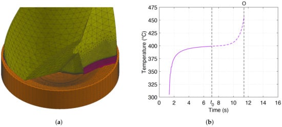 Average temperature in the cutting zone: (a) cutting zone’s mesh in purple; and (b) time evolution.