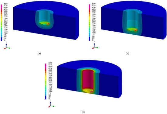 Temperature evolution (C) simulated during the dry drilling operation: (a) phase 1 ( s); (b) phase 2 ( s); and (c) phase 3 (time “O”).