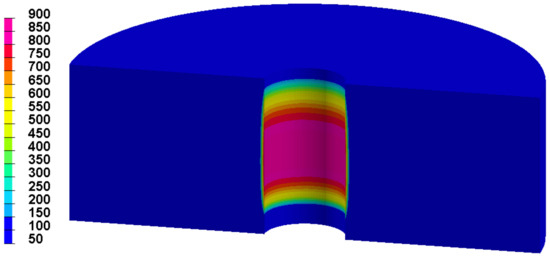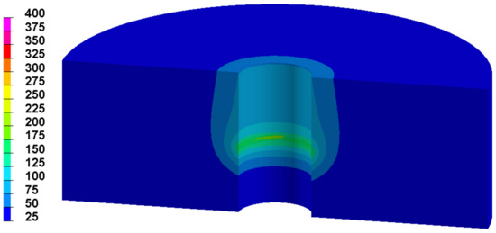 Figure 18 shows the distribution of the hoop residual stress computed with the 3D thermo-elasto-plastic model. The computation time is less than 20 h in a 3.5 GHz standard computer with 64 GB RAM and a mesh containing 159,606 nodes and 853,015 elements. It should be noted that this stress very rapidly decreases under the hole surface. Moreover, the hoop residual stress is almost nil at both the top and bottom of the hole.