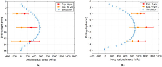 Figure 19a,b show the comparison between numerical and experimental results coming from an XRD analysis for three drilling depths. The simulated residual stresses are obtained at a radial depth of 8 m. Indeed, they are computed at the center of the finite elements adjacent to the hole surface whose radial thickness is 16 m (see Figure 15). As far as experiments are concerned, the maximum values of axial and hoop residual stresses are observed on the surface (0 m), and more particularly at mid-depth. This observation is also true for the 10 m-depth.
