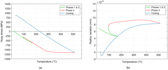 Figure 21a,b exhibit the evolution of the hoop stress and the radius variation computed during drilling at mid-depth on the hole surface. The graph of Figure 21a shows that the thermal strain field generates a compressive hoop state along the whole phases 1, 2 and 3. The beginning of plastification can be identified during phase 3 at a temperature of approximately 280 C, which is greater than the maximum ones of phases 1 and 2.