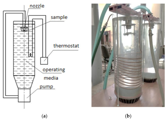 The tests were carried out in water solution with 0.5 wt.% quartz sand fraction 0.4–0.8 mm. The testing process consisted of the following processes: the weighting of the test sample, preparation of the test solution by introducing abrasive particles into it, the supply of this solution to the surface of the sample in the submerged jet mode from a distance of 50 mm and at an angle of 90° to a sample under constant circulation of the solution, weighing the sample after testing and evaluating the results. The diagram of the test stand is shown in Figure 1.