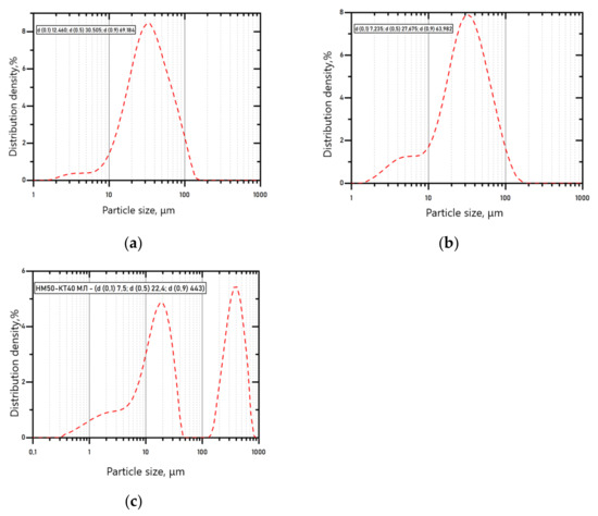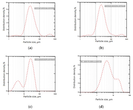 The reaction content of the mechanical mixtures corresponds to the initial powders, Figure 4a,b. Figure 4c has two peaks, and the second peak in the region of 500 μm is the result of the tendency to agglomerate the powder after mechanical alloying.