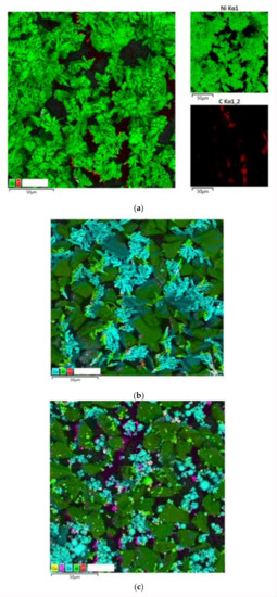 The microstructures of the Ni-Cu coatings exhibit cracks in the form of bundles, Figure 6a,b. The EDS analysis of the Ni-Cu coatings shows an uneven distribution of Cu in the nickel matrix. There are randomly distributed dark islands of Al2O3 in the matrix and in the Ni-Zn coatings and the pure Ni samples.