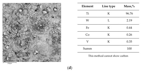 To manufacture the mechanically alloyed powders, the technology of processing a previously prepared mechanical mixture in a cup grinder was used. The mechanical mixture was made in a mixer for 1 h. Before mixing, the powders were dried in an oven for 1 h at a temperature of 120 °C. The compositions and thicknesses of the applied coatings are given in Table 1. Basically, 90–10% and 60–40% ratios of elements were used (some extreme points are selected; in the future, it is planned to further optimize the compositions). Due to the powder size and application modes, the thickness varied from 30 to 200 microns.
