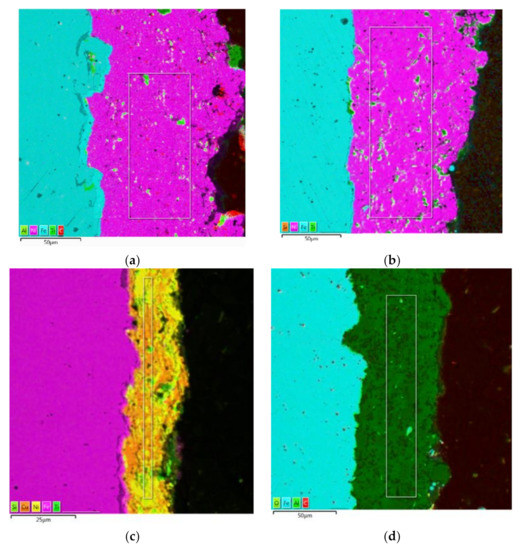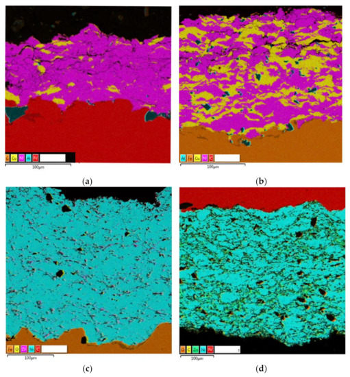 The EDS analysis of the coatings made from the initial powder mixtures shows that the chemical and phase composition remained after spraying, and corresponded to the initial powder material. Figure 6 illustrates the structure of the Ni-Cu and Ni-Zn coatings with various element ratios. As can be seen in the image, the coatings have an even distribution of copper and zinc in the nickel matrix; there are some micro-discontinuities, but no cracks in the structures. The dark areas correspond to the corundum particles contained in the initial powders. Dark “islands” of Al2O3 with an average size of 2–5 microns are visible in the structures. This can be seen in the shades of the spectrum (aluminum and oxygen are indicated together on the energy dispersive spectrum map), and by size (size of the fraction of aluminum oxide) and shape (aluminum oxide has a fragmented form; pores, on the contrary, are usually round).