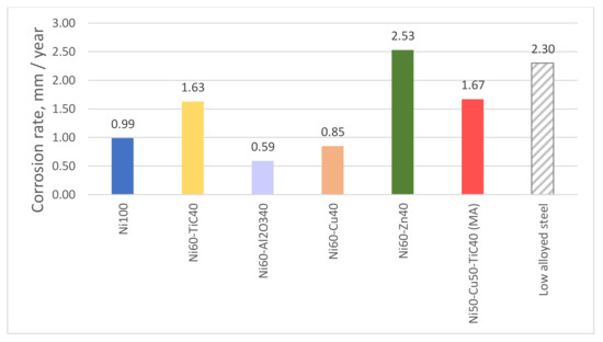 The corrosion resistance of the pure Ni-coating (Ni100) was lower than the samples of the coatings with the addition of Al2O3, at 0.99 and 0.59 mm/year, respectively. The presence of the Al2O3 particles enhanced the corrosion resistance, which could be explained by the lower porosity of the samples. While the addition of the TiC particles did not increase the corrosion resistance of the coatings, this could be associated with the higher porosity of the samples. This assumption is based on weight loss measurements; an assessment of the coating degradation mechanism was not carried out.