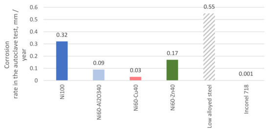 For comparison, the corrosion rate values for low-alloy steel and 718 nickel-based alloy are given in Figure 10. The corrosion rate of the nickel coatings in the autoclave test in 5.0 wt.% NaCl solution saturated with hydrogen sulfide (PH2S = 1 MPa) and nitrogen (PN2 = 5 MPa) at a temperature of +80 °C with pH = 3.5 It can be seen that the Ni-Cu samples have a higher corrosion rate by an order of magnitude compared to Inconel 718. It can also be seen that, compared with low-alloy steel, the studied nickel-based coatings provide significant corrosion protection: the corrosion rates with the coatings are 3 to 10 times lower.