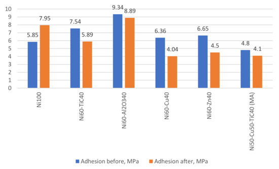 All the samples had a sufficiently high adhesion before the autoclave corrosion tests (Figure 11) except the mechanically alloyed (Ni50-Cu50)60-TiC40 (MA) sample. The adhesion strength of the coating after the autoclave tests shows a decrease in adhesion by 20–40% compared to the initial values.