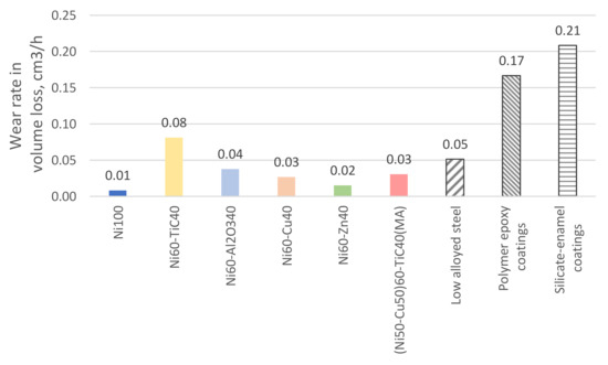 It is worth noting that according to [26], the hydroabrasive wear rates of industrial coatings used for pipelines are 0.17 cm3/(m2·h), on average, for coatings on a polymer epoxy base; 0.2 cm3/(m2·h) for coatings on a silicate-enamel base; and low-alloyed steel pipelines without any coatings have a wear rate of 0.05 cm3/(m2·h). Thus, the results of tests for resistance to hydroabrasive wear show that nickel-based coatings are more resistant than the well-known non-metallic coatings used in industry, and they can be recommended for use in situations with high mechanical particle contents.