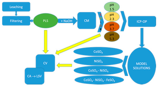 CV measurements were performed in the native PLS (pH 0.5) as well as in NaOH-treated PLSs at pH 3.7 and 5.3. Both NiSO4 and CoSO4 model solutions were also subjected to the CV measurements. Anodic CV branches were recorded upon hold at the cathodic potential limit for 2 min. In order to check the hydrogen evolution reaction’s (HER) contribution to the CV currents in leachates, the base solution was also subjected to CV measurements. All CV measurements were conducted at 25.0 °C at a sweep rate of 10 mV s−1. The metal deposition was carried out potentiostatically at −0.9 V for 60 min, at 1000 rpm under N2 bubbling. Obtained deposits were electrochemically checked using linear sweep voltammetry (LSV). LSV measurements were conducted in a phosphate buffer solution (pH 7.2) with an anodic sweep rate of 10 mV s−1 at 25 °C. A schematic overview of the experimental procedure is shown in Figure 1.