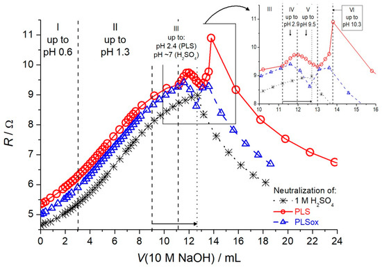 Figure 2 shows generally higher resistances of PLS and PLSox with respect to 1 M H2SO4 as a leaching medium, since some portion of the acid was spent for dissolution of lateritic ore. On the other hand, PLSox is of a bit lower resistance down the curve, which indicates that addition of peroxide causes the oxidation of the ions to attain higher, and, consequently, more conductive states. Up to pH 2.4, the resistance increases, whereas the shape of the curves appears quite similar, with obvious changes in resistance increments per volume of NaOH added. This enables the recognition of the three neutralization phases (I–III), with mid phase II of the most pronounced incremental resistance change (Figure 3). As presented in Figure 3, the three investigated solutions are of similar incremental resistance changes in phases I–III. These phases are then to be recognized as neutralization phases of the excess of acid as a leaching agent. The neutralization of the sulfuric acid ends at around pH 7, indicated as a sudden change from increase to decrease in resistance. In the cases of PLS and PLSox, this transition finally takes place above pH 10, since NaOH is used for precipitation of ions in pH range 2.4–10 through phases IV–VI, as indicated in the inset of Figure 2 in details.