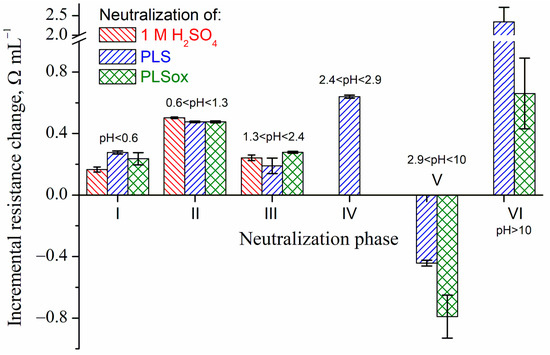 Neutralization of the ions (phases IV–VI) appears much faster than that of the excess of leaching agent because the incremental resistance in phases I–III is lower. In a narrow pH range of 2.4–2.9, there is a unique and fast increase in resistance for PLS, followed by resistance decrease (phase V), which is common for PLS and PLSox. The incremental resistance decrease is much higher for PLSox. It could be that phase IV corresponds to neutralization of lower oxidation states since it is hardly distinguishable in the case of PLSox. Consequently, phase V could be related to the post-neutralization state, after neutralizations of ions in higher oxidation states (the process is much faster for PLSox with respect to PLS).