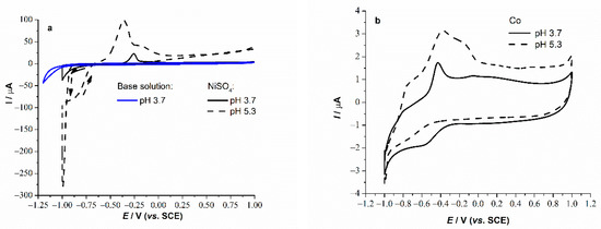 Although there was no pronounced hydrogen evolution even at pH 3.7 down to −1.0 V (Figure 5, blue line), the nickel electrodeposition process depended considerably on the pH value of the solution. It should be taken into account that slightly different Ni2+ and Co2+ concentrations at pH 3.7 and 5.3 solutions (Table 2) could also have an impact on the electrodeposition processes. However, despite lower concentration at pH 5.3, both NiSO4 and CoSO4 at pH 5.3 exhibited more intense anodic peaks compared to those in pH 3.7 solutions. At lower pH, HER, as a side reaction, takes place in model solutions on metal deposits in comparison to the base solution where HER takes place on GC. HER thus spends considerable current, and consequently a lower amount of metal is being deposited. This can be observed as the less intensive anodic oxidation/dissolution peaks. In addition, due to more intense HER, i.e., profound H+ consumption, there is local pH increase near the electrode surface. If the pH value is high enough, hydrolysis of the metal ion as an additional reaction may occur that can lead to the precipitation of the metal hydroxides. Consequently, different phases of a metal in a deposit may occur [15]. Unlike Ni, Co electrodeposition process is less sensitive to pH due to rather low Co concentrations.