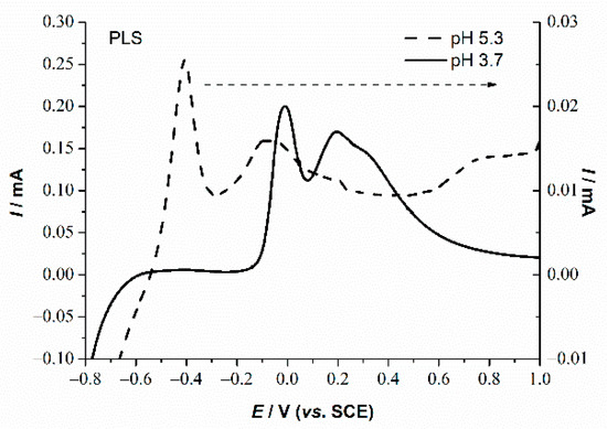 Cyclic voltammograms in native PLS (pH 0.5) and PLSs at pH 3.7 and 5.3 are shown in Figure 4. Reversible Fe3+/Fe2+ redox transition dominates the CV response of PLS at pH 0.5, 3.7 and 5.3 (Figure 4a,b), indicating the excess of 3+ state by higher currents of the reduction peak at around −0.15 V with respect to the anodic counterpart at around 0.9 V. On the other hand, the CVs of the NaOH treated solutions (Figure 4b) are of considerably lower currents due to the removal of iron from the solution. The onset of Fe deposition and a side reaction of hydrogen evolution (HER) in the solution of pH 3.7 take place at around –0.8 V. The presence of the two weak anodic shoulders can be seen at around 0.0 and 0.2 V. These shoulders are transferred to the peak at 0.0 V upon increase in pH to 3.7. A small peak at the potential of 0.7 V indicates that there are still some traces of iron in the solution (Table 2). At pH 5.3, this peak shifted catholically to 0.56 V, while new reversible peaks at around 0.9 V arose due to transitions in the Ni/Co oxides.