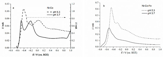 Comparing the starting leachate of pH 0.5 with 111.61 mmol/L of Fe and the solution of pH 5.3, where Fe content was negligible (Table 2.), the goal of Fe removal is reached, as commented further in Figure 4. LSV–Ni–Co consisted of the two main peaks associated to the Ni⟹Ni2+ and Co⟹Co2+ transitions. Like Ni–Co curves, Figure 8, the pH-5.3 PLS curve, Figure 6, consists of the two anodic peaks around −0.4 V. Furthermore, Ni–Co and leachate curves consisted of a broad peak around 0 V, while the peak present in the Ni-curve (Figure 7) was at −0.17 V. This anodic shifting can be assigned to the influence of Co on the Ni–Co LSV curve, which causes the appearance of the broad peak between −0.2 and 0.2 V present in sole Co-curve (Figure 7b). Compared to the Ni–Co curve (Figure 8a), LSV curve related to deposit obtained from Ni–Co–Fe model solution (Figure 8b) consisted of mainly of a peak at around −0.4 V. A peak at 0 V, seen in LSV of both Ni–Co and leachate at pH 3.7 and pH 5.3, is not evident. It seems that the presence of a small amount of Fe can contribute to the suppression of the abovementioned peak (Figure 8).