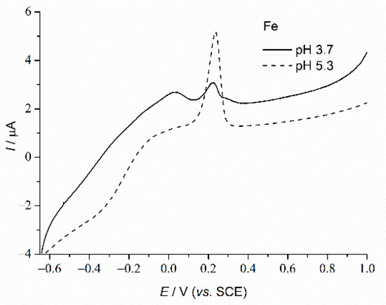 Both Fe-pH5.3 and Fe-pH3.7 (Figure 9) curves contain the peaks related to transitions of different hydroxide forms, indicating that deposits are in the state of the hydroxide rather than metallic Fe [22]. LSV–Fe curves for both Fe-pH5.3 and Fe-pH3.7 (Figure 9) exhibit peaks at 0.0 and 0.2 V which are suppressed at LSV–Ni–Co–Fe curves.