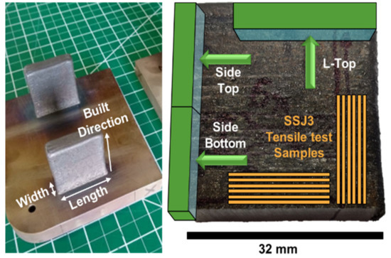 However, to investigate the impact of additive manufacturing and its intrinsic heating, tensile test samples were taken from the center of the “Side-Bottom” region, close to the “Side-Top” region, as shown in Figure 1; all further microstructure characterizations in this manuscript refer to the “Side-Bottom” region.