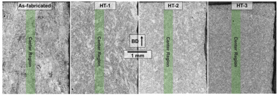 Microstructure characterizations were performed at three positions labeled “L-Top”, “Side Top”, and “Side Bottom”, as shown in Figure 1. An overview of the grain structure and the difference between the boundary (top of each micrograph) and center of the as-fabricated and heat-treated samples are shown in Figure 2. Each image shows a 3.4 mm width and 4.9 mm length of the “Side Bottom” cut piece, with the top of each micrograph showing the cut between the “Side Bottom” and “Side Top” sample, as displayed in Figure 1. The build direction is from bottom to top in Figure 2. The optical micrographs for each heat treatment demonstrate a more homogenous microstructure in comparison with the as-fabricated condition. Some regions were etched less and led to some brighter spots in comparison, displayed for the EUROFER-like HT-1 and the CNA-like HT-2 micrographs in Figure 2. Those regions exhibited far fewer high angle grain boundaries, but martensite structures within the prior austenitic grains were clearly visible. EBSD methods were deployed to identify grain boundaries and kernel average misorientations as a measure to determine martensite and delta ferrite regions.