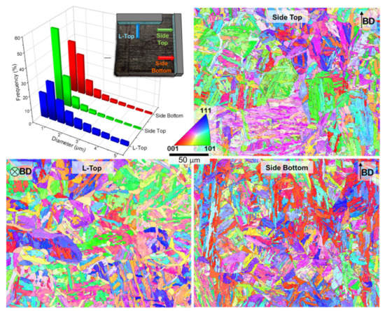 Several EBSD maps were taken in the center of the width of each sample in an attempt to minimize the impact of varying cooling rates between the center and boundary regions, the goal of which is to give better comparability between the as-fabricated and heat-treated samples. Grain sizes are shown together with inverse pole figure maps in Figure 3 exemplarily for the as-fabricated condition with a binning of 0.5 micron. The grain sizes along the build direction (BD) demonstrate a significant difference in the frequency of small grains—with 55 percent of the grains smaller than 0.75 micron in the “Side-Top” region in comparison to only 40 percent of the grains exhibiting a grain size smaller 0.75 micron in the “Side-Bottom” region. The observed grain growth appears to be the effect of an intrinsic heating of the already printed material (i.e., “Side-Bottom”) when new layers of material are printed on top (prevalent for “Side-Top”). To investigate the impact of this intrinsic heating, the mean grain diameters for all areas and sample conditions are compared in Figure 4.