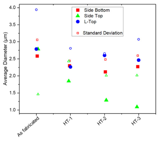 Mean diameter of three center areas for as-fabricated and heat-treated conditions. Full symbols represent the mean diameter, while corresponding open symbols represent the standard deviation.