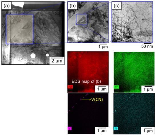 TEM micrographs are presented in Figure 12. Figure 12a shows a STEM micrograph of HT-2, which clearly shows the presence of a tempered martensitic structure with a high density of precipitates. EDS mapping was performed at a higher magnification to understand the overall distribution. Chemistry and morphology of the precipitates are shown in EDS maps of the region displayed in Figure 12b, which clearly show the presence of two morphologies of precipitates. EDS maps suggest that the Cr-rich larger precipitates potentially could be classified as M23C6 and the finer V-rich precipitates could be V(CN). The nitrogen maps demonstrate preferential segregation of nitrogen to the vanadium-rich regions. It is also observed from the EDS maps that tungsten segregates to the chromium-rich regions.