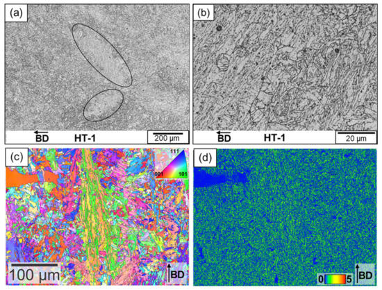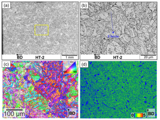 Characterization of the samples after PPHT (HT-2 treatment) (a,b). Optical micrographs showing a tempered martensitic structure with sporadic delta ferrite stringers (c). Inverse pole figure (d). Kernel average misorientation maps clearly show the presence of delta ferrite.