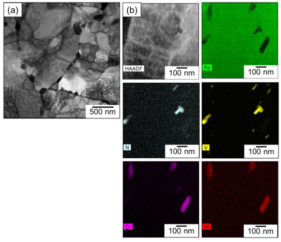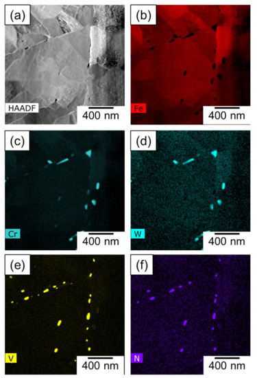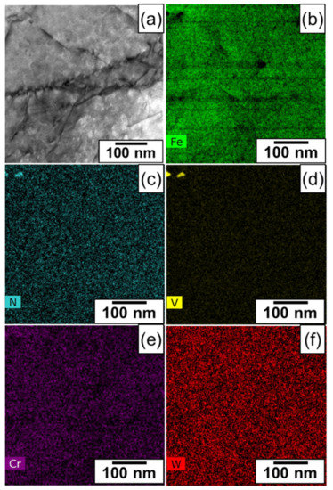 A STEM micrograph presented in Figure 9a demonstrates limited recovery in the martensite laths—possibly due to the lower normalization and tempering temperatures compared to previously published research on similar RAFM steels [1,2]. While large M23C6 precipitates could be observed in EDS maps shown in Figure 9b–f, those maps also show that the finer MX carbides are absent and not observed in the number densities previously observed. Therefore, to re-confirm this observation, an EDS map at higher magnification was recorded and the results are summarized in Figure 10a–f, showing the STEM image and the associated elemental maps.