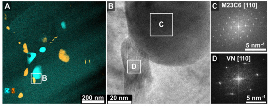 EDS map of Cr and V of HT-2 (A). HR TEM micrograph (B) of area B is shown with micrographs (C,D) displaying the FFT of the highlighted areas C and D. The corresponding EDS map (A) identifies V-rich regions as MX and Cr-rich regions as M23C6.