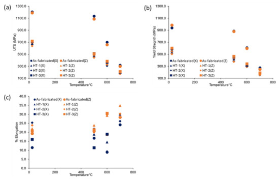 Mechanical properties for tensile test samples at different temperatures in all conditions perpendicular to the build direction (X) and in-build direction (Z). Ultimate Tensile Strength (a), Yield Strength (b), and Elongation in % (c) were plotted against the test temperature.