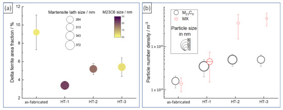 We now move to the discussion of the microstructure evolution during post-processing heat treatments. From the previous section, it is clear that after post-processing treatments, the microstructure typically exhibits a reduction in delta ferrite content and demonstrates recovery of martensite sub-structure and an increase in the number density of precipitates. These results are summarized in Figure 18. Here, it is obvious from Figure 18a that extended tempering duration coarsen M23C6 precipitates, displayed by the color of the circles, while the tempering times barely have an impact on the martensite lath size. However, all heat treatments were successful in reducing the delta ferrite. Figure 18b distinguishes between M23C6 and MX precipitates and highlights the impact of the heat treatments on those precipitates. All heat treatments have a similar impact on M23C6 by tripling the number density, but HT-2 and HT-3 demonstrate that the higher normalization temperatures have a positive influence on the size and number density of MX precipitates, which function as sinks for dislocations and defects created under neutron irradiation. A shorter tempering time, as in HT-3, demonstrates the lowest coarsening of M23C6.