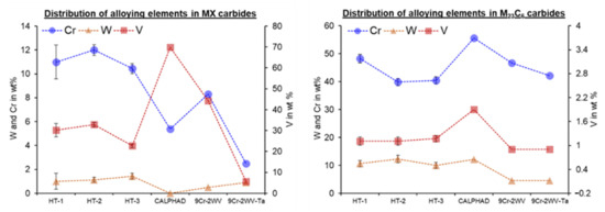 To evaluate the effects of post-processing on the fine structure of the precipitates, the EDS maps were quantified to quantitatively assess the distribution of different elements in different precipitates, which are presented in Table 4. In addition, the information is graphically presented in Figure 19, which shows the distribution of Cr, V and W in MX and M23C6, respectively. The data obtained in the present study are contrasted with those from the literature. Fe was not stripped during the EDS quantification, as it is also an element inside M23C6 and MX precipitates, as shown in Table 4.