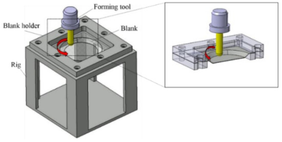 However, when the tool rotates at a high speed, the large amount of heat generated by rotational friction between the tool and the material is beneficial to the metal’s formability. Using this method, Park et al. [11] successfully formed a magnesium alloy sheet (hard-to-form material) without any lubrication (dry friction state). In their research, a large amount of heat (up to 200°) was generated due to excessive friction between the rotating tool and the unlubricated sheet, which significantly improved the plastic deformation ability of the magnesium alloy. This method was called friction stir incremental sheet forming (FS-ISF) by Otsu et al. [12].