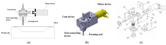 Based on SPIF technology, in this study, an LFV-SPIF system was developed where low-frequency vibrations were applied to the forming tool. The LFV-SPIF system (Figure 2) comprises a forming tool connecting device, motor, and cam system. In this vibration application setup, the motor provides a stable processing force. The designed cam device converts the motor’s uniform speed rotary motion to a uniform reciprocating motion in the Z-direction. Through calculation, along the circumference of the cam’s central axis 14 equal divisions are made to establish 14 peak points so that the designed cam device can convert the natural frequency (90–1700 rpm/min, controlled by the controller) of the motor into 0–100 vibrations per second vertically. Consequently, the forming tool could have an arbitrarily adjusted low-frequency vibration of 0–100 Hz in the Z-direction. In the LFV-SPIF system, forming tools with different diameters can be arbitrarily replaced. The CNC control can freely adjust the amplitude from 0 to 100 μm.