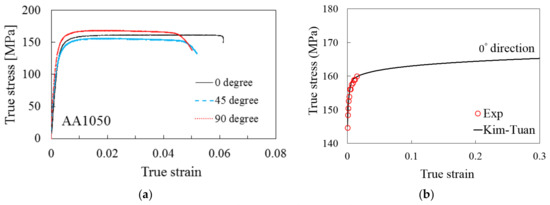(a) True stress–strain curves of AA1050, (b) Curve fitting by the Kim–Tuan equation.