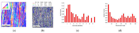 In addition, the EBSD results of the as-received AA1050 sheet are shown in Figure 4. It is shown in Figure 4a,c that the grain size was nonuniform. Moreover, the misorientation angles between grains were relatively small and the low angle grain boundary accounted for more than 15%, as shown in Figure 4b,d. These two microstructural characters were caused by the rolling process.