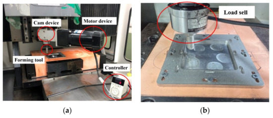 Figure 5a shows the experimental setup of the LFV-SPIF system in which a load cell (NTS-LRL-10kN) was connected to the forming tool for measuring the axial forming force during the forming process (Figure 5b). An AA1050 specimen of 100 mm × 100 mm was cut using laser cutting for forming. In addition, a slide-way oil with a kinematic viscosity of 68 was used for lubrication.