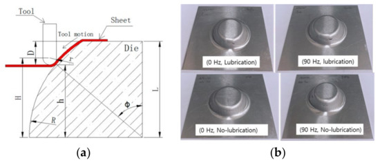 With the development of vibration-production technology, low-frequency vibration can be superimposed with micro-amplitudes in sheet metal forming, called low-frequency vibration forming (LFVF). The softening and hardening effects in UVF also appear in LFVF. LFVF has lower costs, and can tolerate a greater forming force, than UVF, and is more suitable than UVF when used in practical industries requiring large forming forces. Many scholars have focused on developing LFVF technologies. Maeno et al. [25] developed a vibration-assisted plate-compression process to prevent a sharp increase in the load using a servo press. Elastic recovery between the die and plate automatically fed the liquid lubricant into the gap due to vibration, significantly improving the lubrication and markedly decreasing the compressive load.