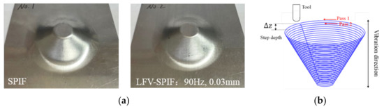 The axial forming force is a vital indicator for evaluating the forming conditions. To study the effect of low-frequency vibration on the axial forming force , Table 4 lists the forming parameters used in the experiment; the vibration parameter (frequency, amplitude) had four levels and other normal parameters were fixed. In addition, the axial forming force under different vibration variables was studied using a truncated cone shape with a diameter of 70 mm and a depth of 15 mm, as shown in Figure 7a. The profile toolpath was used in this study (Figure 7b). As the step depth and feed rate were fixed at 0.5 mm and 400 mm/min, there were, in total, 30 circles that needed to be formed, while for all the cases, the forming time was the same.