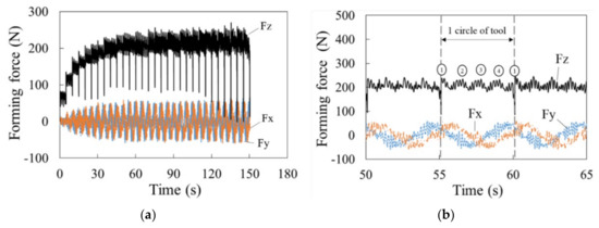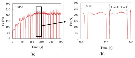 (a) Measured axial forming force Fz of AA1050 during SPIF process, and (b) the detail forming force behaviors at one forming circle.