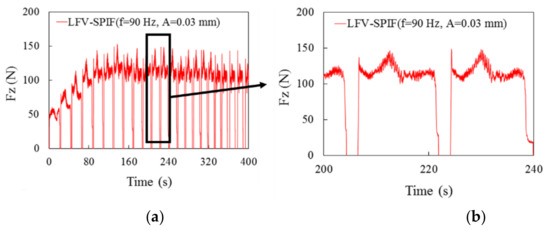 (a) Measured axial forming force Fz of AA1050 during the LFV-SPIF process, and (b) the detail forming force behaviors at one forming circle.