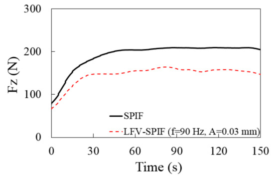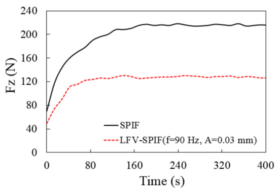 In addition, the mathematical smoothed forming force of the two processes were compared—by integrating low-frequency vibrations, a significant axial forming force reduction can be obtained in the SPIF process. As the frequency increased to 90 Hz, the axial forming force of the AA1050 was reduced by 45.6% (Figure 10).