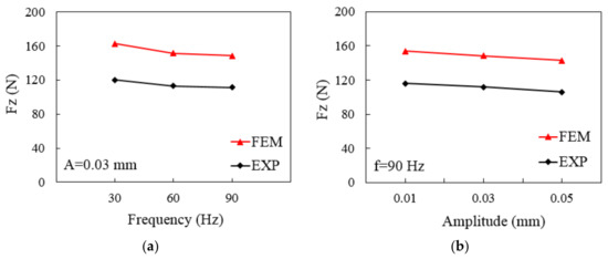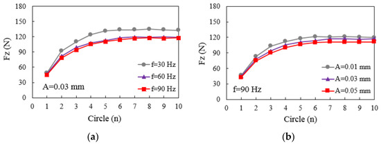 Axial forming force of each circle under (a) different frequencies, and (b) amplitudes.