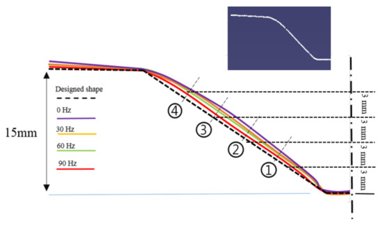 Comparison of the measured section for formed shapes of the AA1050 sheet at different frequencies.